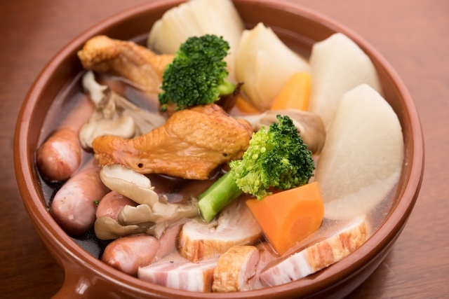 ①鍋に大ぶりに切った野菜(じゃが芋、にんじん、キャベツ、大根など)と、適当な大きさに切ったベーコン、スモーク手羽元、水を入れて、野菜が柔らかくなるまで煮ます。