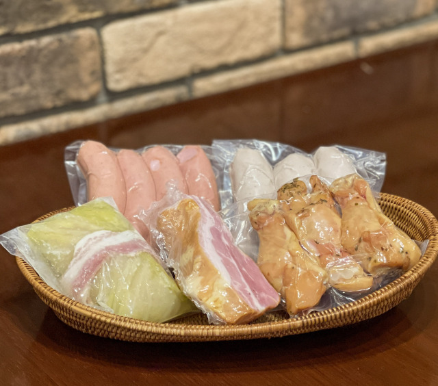 <セット内容>・パンチェッタ(ブロック)約130g・スモーク手羽元3本・ロールキャベツ1ヶ ・フランクフルト4本・ヴァイスヴルスト3本
