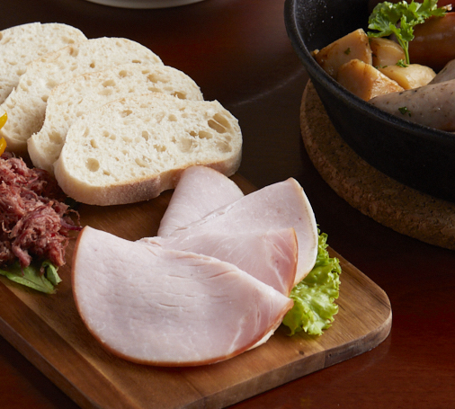 厳選した国産豚ロース肉を、一週間塩漬けして熟成させ、じっくりスモークして、ロース肉の旨みを引き出しました。ほど良い塩気と、しっとりとした食感が特長の自慢の逸品です。